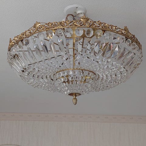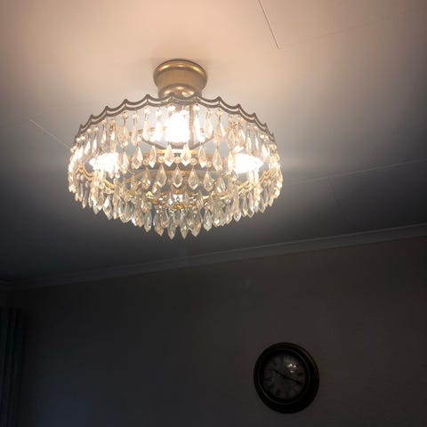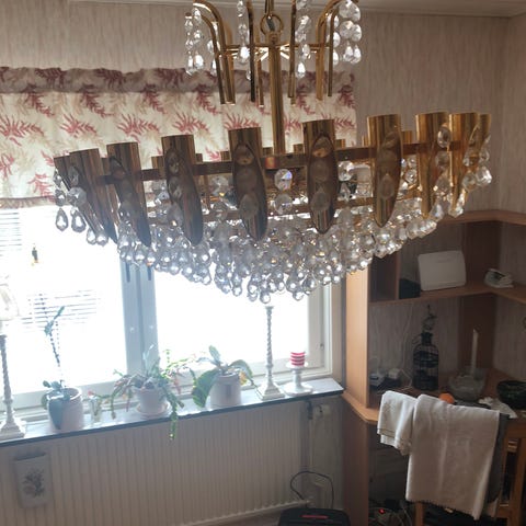 ERIKSMÅLAGLAS, takarmatur, 1960/70-tal. Stomme av mässing, behängd med prismor.