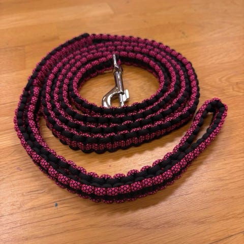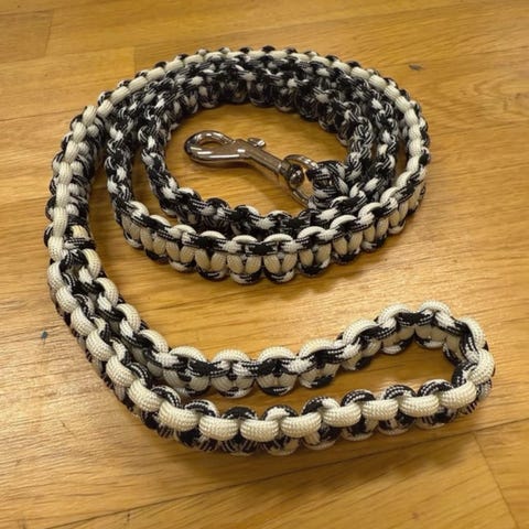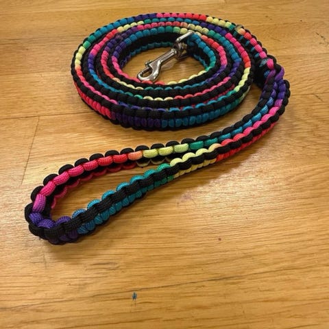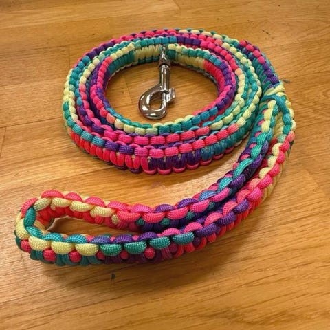 Hundkoppel och halsband i flätad paracord i gröna och gula nyanser. Setet består av ett längre koppel med handögla och metallhake samt två halsband med plastspännen. Passar för promenader och vardagsanvändning med hund. Materialet är syntetiskt rep (paracord) som är lätt och tåligt. 170cm + 2 halsband ett 56 cm två 35 cm