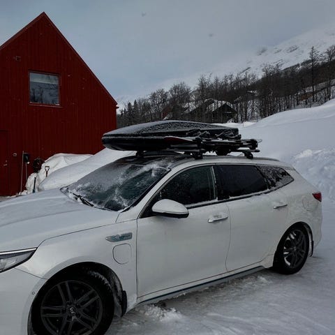 Vi har haft boxen på en Kia Niro årsmodell 22. På den passar den precis så att bakluckan gå att öppna, så inte en mindre bil än så. Det här en ganska "slimmad" modell med lägre luftmotstånd i storkeksklassen "medelstor", men rymmer många par slalomskidor och även längskidor, lite pjöxor, hjälmar m.m. Innermåttet lite kortare än yttermåttets 225 cm, så kanske 220 för längdskidor?(minns inte längden på mina).