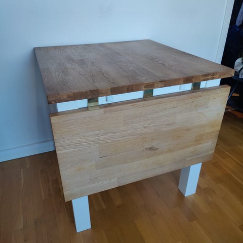 Litet köksbord med 2 klaffar, bredd 80x70cm, utfällt 130cm, höjd 72cm.