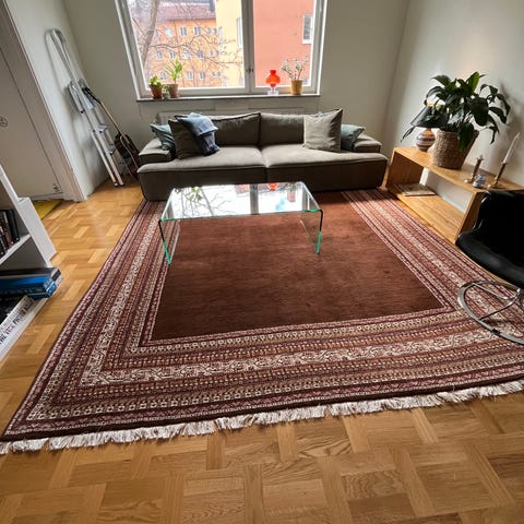 Patchwork matta i röd mönstrad design. Passar bra i vardagsrum eller större rum. Rektangulär form med patchworkmönster i olika röda och beige toner. Lämplig som golvtextil för att skapa en mjukare yta och dämpa ljud i rummet. 350×250 cm