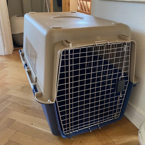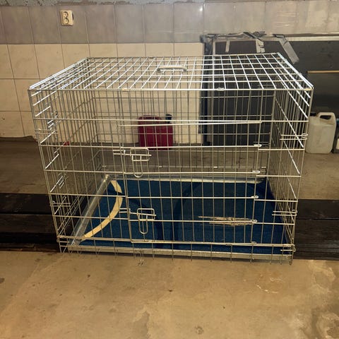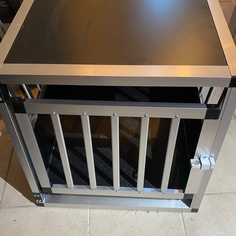 Mjuk hundbur/transportväska i tyg. Till buren följer flera hundtillbehör, bland annat sele, koppel, hundbädd, matskålar i metall, flexikoppel samt diverse skötsel- och fodertillbehör. Passar för transport och vila för mindre till medelstora hundar, hemma eller i bil.