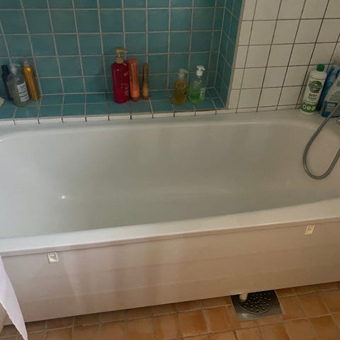 Badkar i vit standardmodell. Rektangulär form med frontpanel.