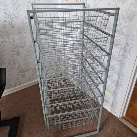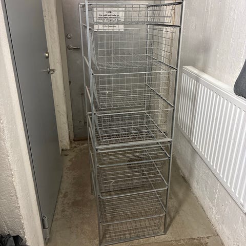 Elfa förvaringssystem med stomme i metall och flera utdragbara meshbackar i grå färg. Backarnas höjd är 18,5cm och bredd och djup är 52,5cm. Passar för förvaring i garderob, förråd, tvättstuga eller garage. Öppen nätkonstruktion i backarna ger god överblick och ventilation av innehållet. Systemet är fristående och kan placeras mot vägg eller inne i garderob beroende på utrymme.