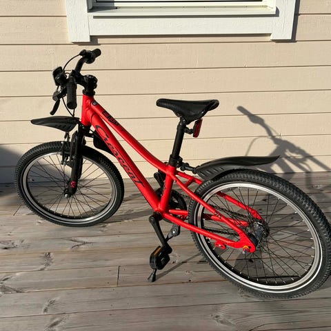 Barncykel med 20" hjul i blå färg. Utrustad med skärmar fram och bak, handbromsar och stöd. Passar barn som är redo för en något större cykel med växlar och handbroms, lämplig för vardagscykling till skola och fritidsaktiviteter.