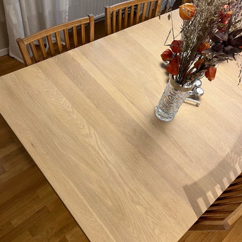 Matbord i vitoljad ek med två iläggsskivor säljes