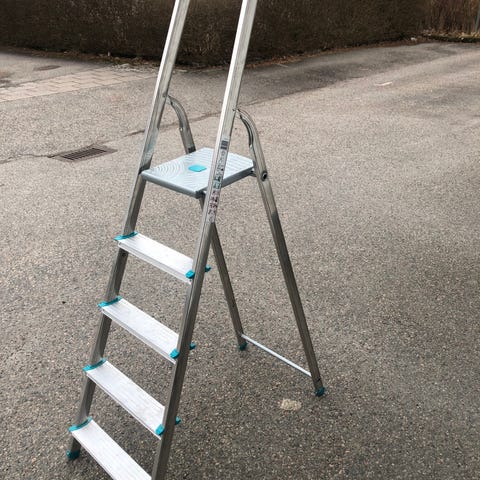 Aluminiumstege med fyra steg. Fristående modell med plattform överst. Lämplig för arbete både inomhus och utomhus där extra räckhöjd behövs, till exempel vid målning, underhåll eller montering. Stabil konstruktion i metall med räfflade steg för bättre fotfäste.
