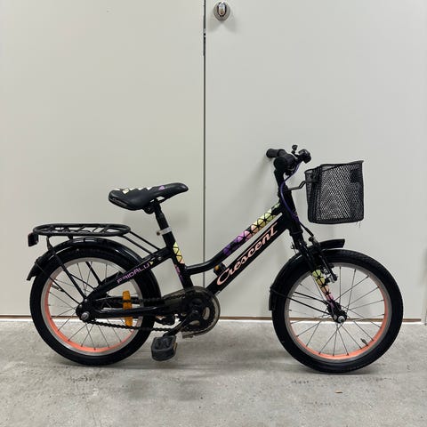 Säljer en Crescent barncykel med 16-tums hjul. Allt fungerar som det ska. Utrustad med fotbroms bak, handbroms fram, stänkskärmar, pakethållare, stöd och kedjeskydd. Kedjeskyddet är lite trasigt men fungerar fint. Bra cykel för vardagscykling och kortare turer.