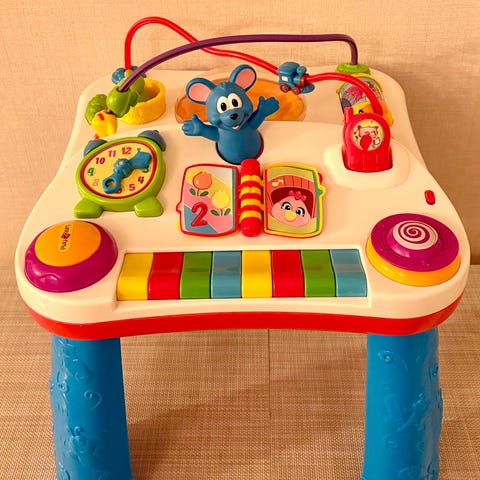 Roligt aktivitetsbord i olika färger. Aktivitetsbordet har sex inlärningsstationer som aktiverar barnet på olika sätt. Barnet lär sig om bokstäver, former, tid, tal, musik och färger. Bordet kan växa med barnet då det har avtagbara ben, från det att det kan sitta ner till det att det kan stå upp.