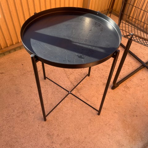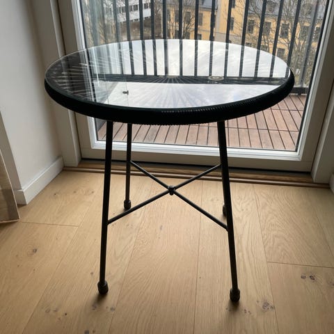Runt sidobord i metall med svart stativ och bordsskiva i glas. Bordsskivan har ett mönster med strålar från mitten. Passar som litet soffbord, avlastningsbord eller balkongbord inomhus eller under tak utomhus. Bordet har fyra ben med korsstag för extra stabilitet.50cm i diameter 52cm hög