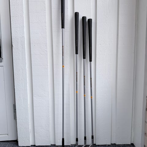 golfklubbor i stål. Setet innehåller flera järnklubbor med numrering 4, 5, 7, 8 och 9 samt putter och 1 drive.