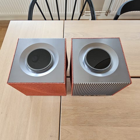 Ena högtalaren har en liten skada på ena nedre främre hörnet (visas på sista bilden) men ingenting som påverkar funktionen på ngt sätt.