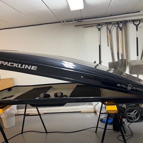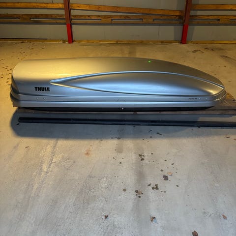Thule Motion takbox i vit och svart färg. Takboxen är av hårdplast med undersida i svart och ovansida i vit. Den är avsedd för montering på takräcken på personbil för extra lastutrymme, till exempel för bagage eller sportutrustning. Boxen har aerodynamisk form och öppnas från sidan. Fästen för montering på takräcke ingår enligt bild. Har suttit på Passat Alltrack. Använts en gång