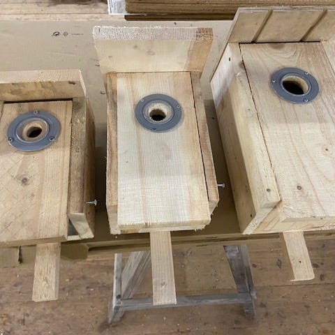 Fågelholkar enligt bild.Lätta att rensa 30mm ingångs hål till mindre fåglar . 40mm ingångshål passar dom flesta fåglar i vår trädgård 100kr .Tornseglar holk 250kr.Tillverkade av 22mm fur o gran.vill dom ha större hål så kan dom göra det perfekt till pyssel boden måla dom i glada färger .Fåglarna gör ett gott jobb i träd gården med mygg o annat flygande kryp