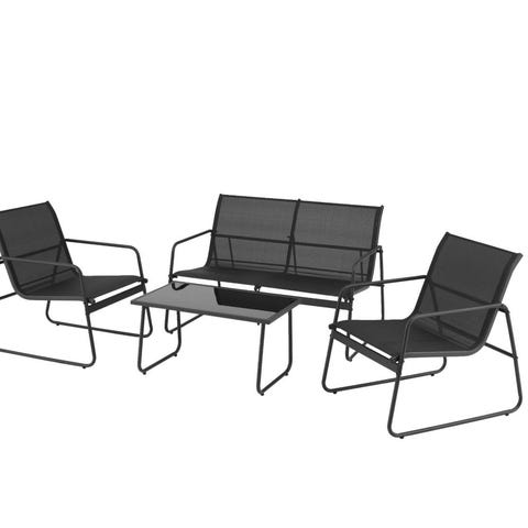 Elegant balkongset med praktisk förvaring. Pulverlackad stål. I setet ingår tre hopfällbara stolar och ett bord.