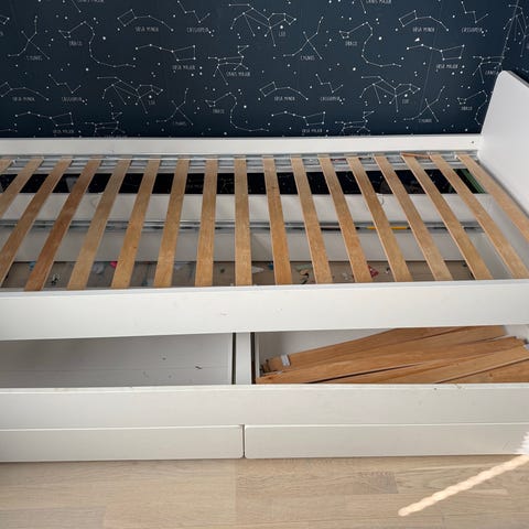 IKEA sängram med förvaring. Säng 80x200, kan dras ut till 160x200, har träribbotten och två utdragslådor under liggytan som kan användas för förvaring. Pris gäller sängborden, men 2 madrasser finns att köpa för den som önskar. 400kr för sängram, 1000kr inkl. madrasser.