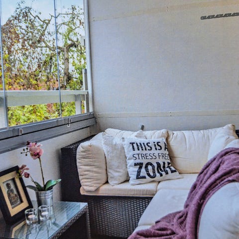 Loungesoffa i konstrotting med tillhörande bord och pall. Soffan har mörkgråa dynor och ryggkuddar. Möbelgruppen är avsedd för utomhusbruk, exempelvis på altan eller uteplats. Bordsdelen har några sprickor i ovandel på rotting men syns knappt när glasskivan ligger på. Nya dynfodral inköpta 2025.