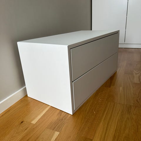 2 stycken vita sängbord som hängs upp på väggen. Är från MIO och heter Plint. Säljer pågrund av flytt.