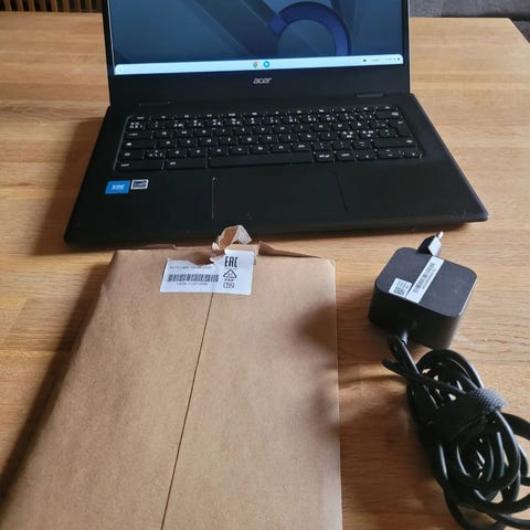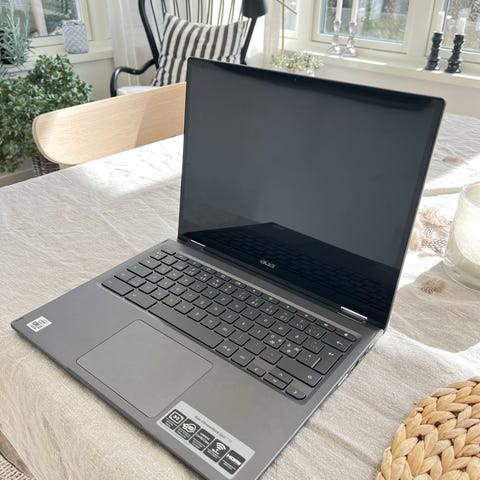 Acer Chromebook bärbar dator i silverfärg. Datorn har ett tangentbord i fullstorlek och styrplatta samt skärm anpassad för vardagligt arbete och surf. Operativsystemet är ChromeOS, vilket är anpassat för webbaserade tjänster och appar från Google. Med pekskärm