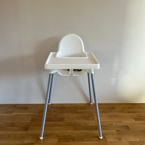 IKEA barnstol Antilop med bricka i vit plast med grå metallben. Stolen har hög rygg och bälte att spänna. Brickan är avtagbar och har upphöjd kant runtom försatt undvika spill Passar som matstol för små barn vid bord i kök eller matplats - även utomhus. Två stolar säljs: en stol för 75 kr alt. Två stolar för 140 kr.