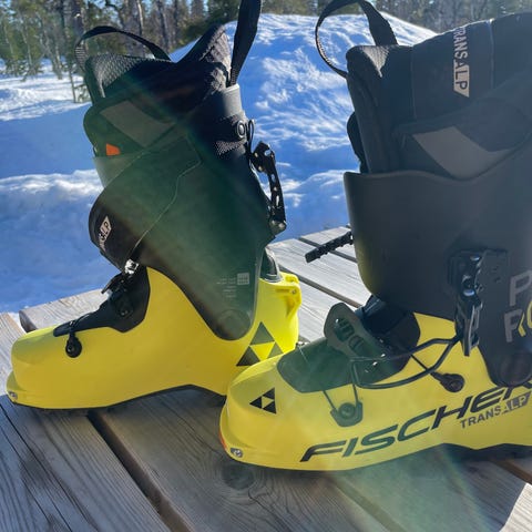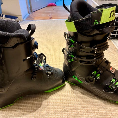 Lange pjäxor i hård plast med flera justerbara spännen framtill och kraftigt hälspänne. Färg i huvudsak mörkgrå/lila med detaljer i gult och orange. Passar för alpin skidåkning och är utrustade med rem upptill för bättre åtdragning och stabilitet runt vrist och underben. Ytterskalet är utformat för att ge stöd och kraftöverföring mellan åkare och skida.
