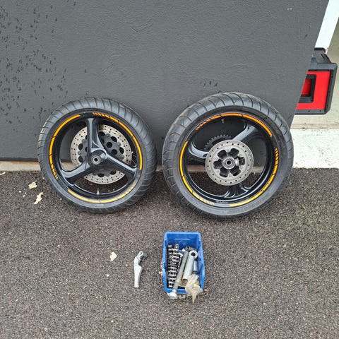Svarta KTM Six Days fälgar 18 tum bak och 21 tum fram. Med Mitas dubbade c16 och c17 i ok skick. Michelin ultra heavy duty slang fram och bak. Bromsskiva i ok skick på bakhjulet. Drevet bör bytas. Fälgarna kommer från en 2018 årsmodell men passar alla KTM stora hojar 125-500 från 2003 och framåt beroende på vilka distanser man har. Inga distanser medföljer.