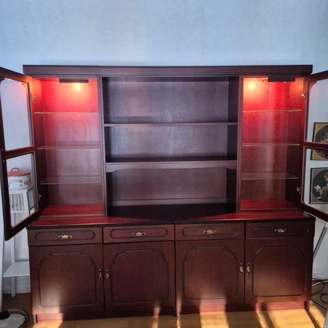 Vitrinskåp, stomme i trä med beslag i metall. Invändig belysning. Tre hyllplan i glas.