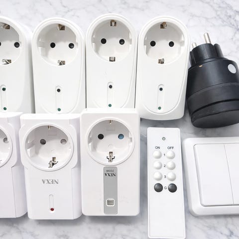4 stycken deltaco smart plugs modell sh-p01 och 2 stycken smarta glödlampor (en rgb, en vit).