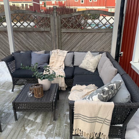 Hörnsoffa med bord för uterum grå dynor