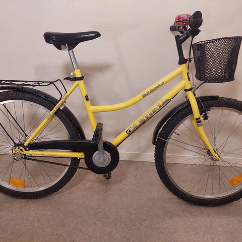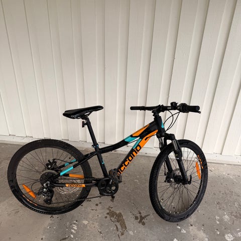 Barncykel med 24" hjul i orange färg. Utrustad med framgaffel med dämpning, handbromsar fram och bak samt växlar med reglage vid styret. Passar barn som behöver en cykel i mellanstorlek för vardagscykling och enklare turer på blandat underlag.
