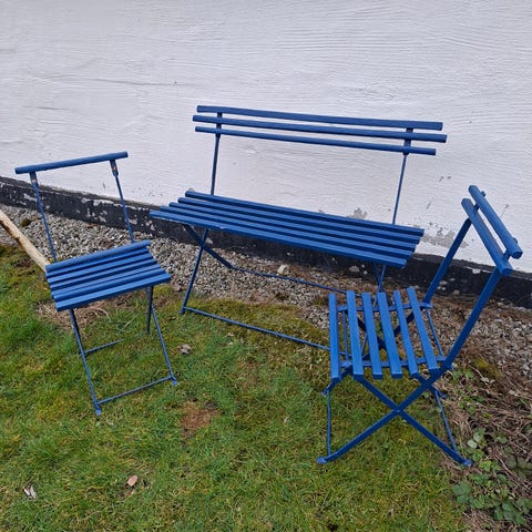 Stadiga möbler som är tillverkade i metall och har en mörkblå färg.