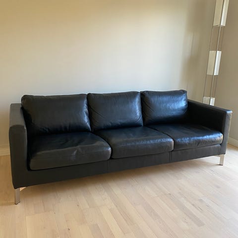 Skinnsoffa från IKEA, svart, modell Karlstad, 205 cm lång, 89 cm djup och 78 cm hög.