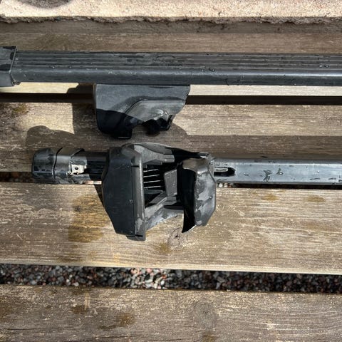 Takräcke i aluminium i silverfärg. Består av två lasthållare med svarta plastfötter. Har suttit på Volvo V60, 2017 rail. Kontrollera mått och kompatibilitet mot aktuell bilmodell innan användning.