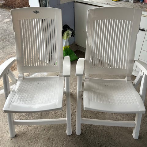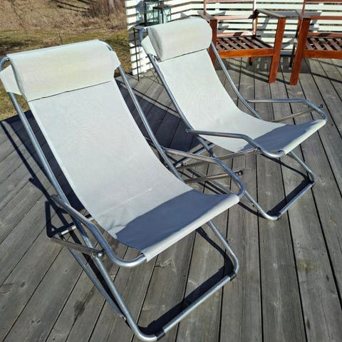 Fällbara positionsstolar med tillhörande dynor i blått och grått. Stolarna har armstöd och hög rygg. Dynorna är vadderade och anpassade för utomhusbruk, exempelvis på altan, balkong eller i trädgård. Stolarna är lämpliga som trädgårdsstolar eller campingstolar där man vill kunna justera sittläget.