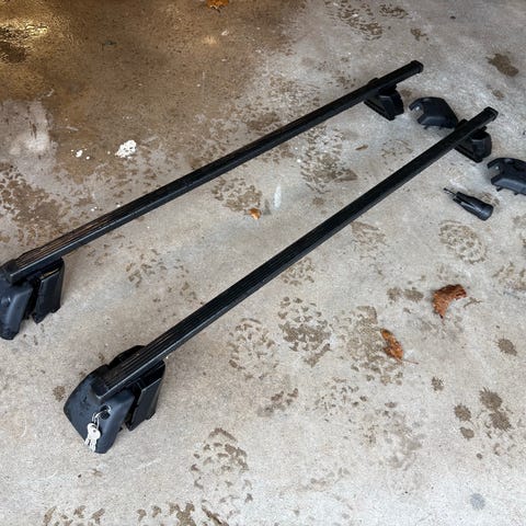 Takräcke i svart metall. Består av två tvärbalkar med justerbara fästen. Passar bil med motsvarande infästning på taket, har suttit på Volvo V70 2009 rail. Lämpligt för montering av till exempel takbox eller lasthållare, beroende på bilmodell och tillbehör som används.
