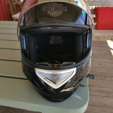 Harley-Davidson integralhjälm i svart färg. Hjälmen har heltäckande visir framtill och ventilationsöppningar upptill. Märkt med Harley-Davidson-logotyp framtill. Passar motorcykelåkning där en integralhjälm önskas för mer täckning runt huvud och ansikte. Storlek 59-60