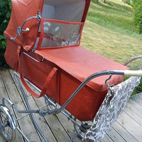 Liggvagn i cerise plysch, hög modell. Handtaghöjd 100cm.