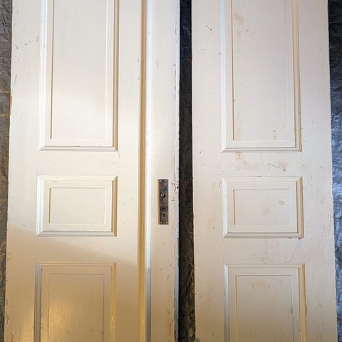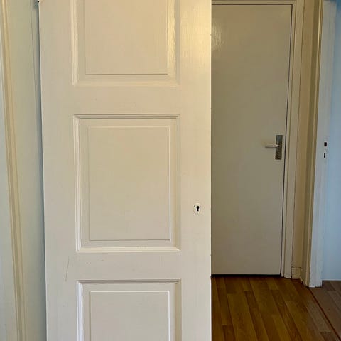 Vitmålad innerdörr i trä med flera rektangulära speglar. Dörren har klassiskt utseende med profilerade speglar. På bilderna syns beslag, nyckelhål med nyckel samt handtag/knopp. Passar som innerdörr i bostad eller liknande utrymme. Exakta mått och gångjärnssida behöver kontrolleras vid hämtning eller enligt säljarens uppgifter.