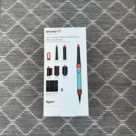 Dyson Airwrap multistyler hårstyler i lila/orange. Setet innehåller flera olika stylingmunstycken, bland annat runda och platta borstar samt cylindriska locktillbehör för olika typer av styling.