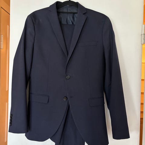Blå kostym(kavaj,byxa,slips) till examen. Använd en gång vid examen åk9. Vit skjorta finns att köpa till för 100kr. Strl50, Jack and Jones.