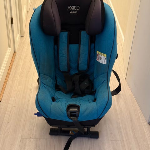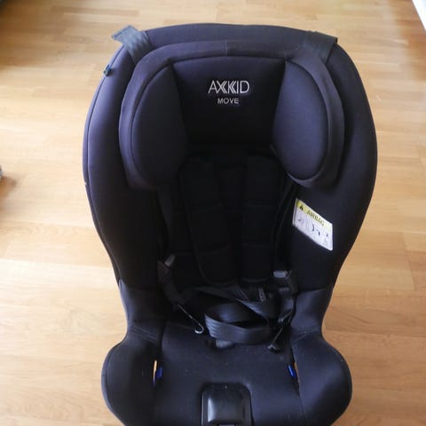 Axkid Minikid bilbarnstol för barn 0–25 kg. Bakåtvänd bilbarnstol med intern fempunktssele och justerbart huvudstöd. Klädsel i mörk, textil liknande material. Stolen monteras med bilens trepunktsbälte och stödben enligt anvisningarna på stolens etikett. Godkänd enligt ECE R44/04. Passar för användning i bil för småbarn upp till ca 25 kg, med fokus på bakåtvänt åkande så länge som möjligt.