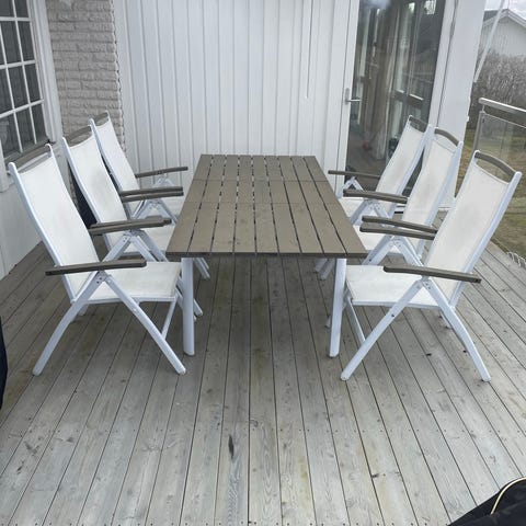 2m långt bord samt 6st stolar med fällfunktion och vita dynor.