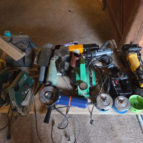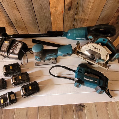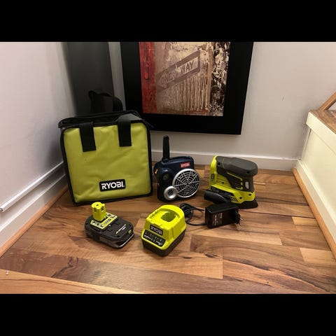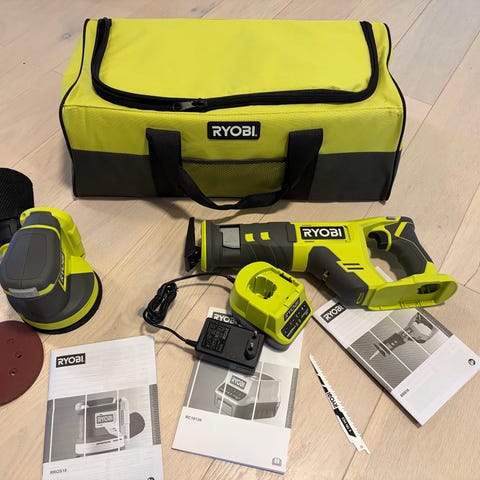 Ryobi elverktyg set. Flera batteridrivna verktyg i samma serie, bland annat slipmaskiner och andra handverktyg. Passar för olika typer av hemmafix och enklare renoveringsarbeten där portabla elverktyg behövs. Batteri och laddare förekommer på bilden, kompatibla med Ryobi-systemet som syns i annonsen.ny pris för allt är 4000kr