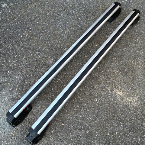 BMW takräcken i aluminium i silverfärg med svarta plastfästen. Räckena är avsedda att monteras på bilens tak och har integrerade spår för infästning av tillbehör som takbox eller cykelhållare. Levereras som ett par tvärgående räcken med färdiga fästpunkter och låsbar infästning beroende på bilmodell och låscylindrar. Passar utvalda BMW-modeller enligt märkning på räckena; kontrollera artikelnummer och märkning mot din bil för korrekt passform.