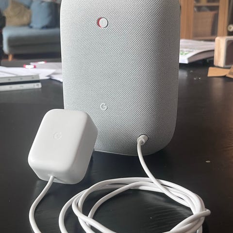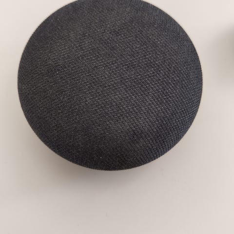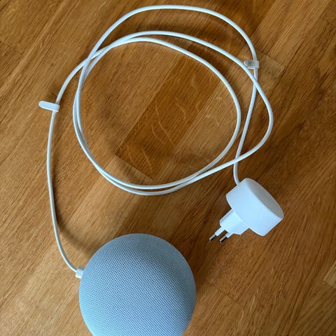 Google Nest Mini smart högtalare i mörkgrå färg. Kompakt modell med tygklädd ovansida och gummibelagd undersida. Ansluts med medföljande nätadapter och kabel. Högtalaren är avsedd för röststyrning, musikuppspelning, timers, väderinformation och styrning av kompatibla smarta hem-enheter via Wi-Fi när den är kopplad till ett nätverk och ett Google-konto.