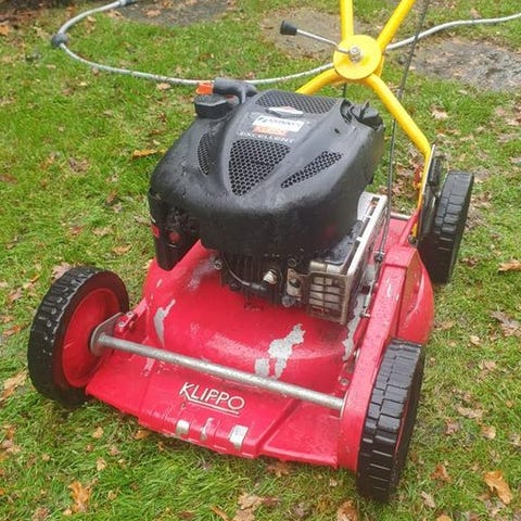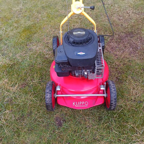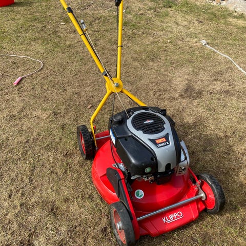 Klippo gräsklippare med drivning i bra skick drivningsvajern defekt och uppsamlar påsen saknas pris 1850 kr