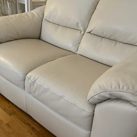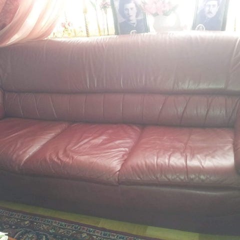 Soffgrupp i brun läderimitation eller läder bestående av en 3-sits soffa och två fåtöljer. Möbelgruppen har stoppade sitt- och ryggdynor med markerade sömmar samt rundade armstöd. Träsockel eller trädetaljer syns längst ned på soffan. Passar som sittgrupp i vardagsrum eller tv-rum. Färg: brun. Material: läder eller läderimitation (okänt exakt material). Antal sittplatser: cirka tre personer i soffan samt en person per fåtölj.