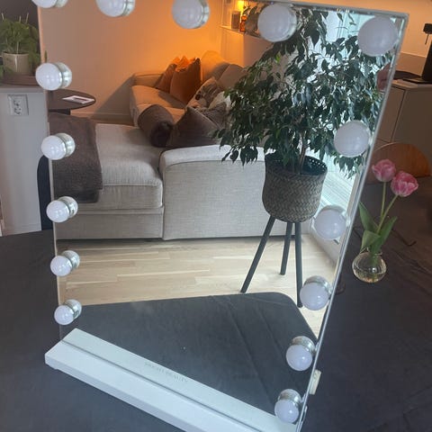 Rusta sminkspegel med belysning. Spegeln har inbyggda lampor runt kanterna som ger jämnt ljus vid sminkning eller styling. Strömkabel ingår för anslutning till eluttag. Lämplig att placera på sminkbord eller annan plan yta i sovrum eller badrum där extra belysning behövs vid spegeln.