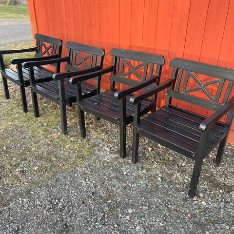 Fyra trädgårdsstolar i vitmålat trä. Klassisk modell med armstöd, ribbad sits och kryssmönster i ryggen. Passar för uteplats, altan eller trädgård. Säljes med tillhörande bord