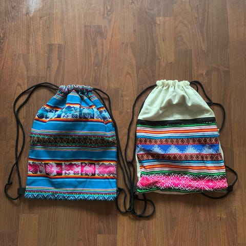Adidas ryggsäck/gympapåse i tyg. Ryggsäcken har ett flerfärgat blommönster på ljus botten och Adidas-logga framtill. Dragskostängning med vita axelremmar som kan bäras på ryggen. En extra dragkedjeficka finns på sidan för mindre saker.